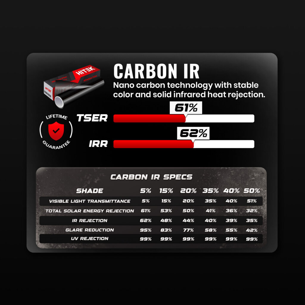 Carbon IR is a color-stable film with high heat rejection. This carbon film is engineered with nanoparticles for added heat rejection without any interference with electronic signals. If you have been thinking about adding a carbon film to your vehicle, look no further than HITEK’s Carbon IR.