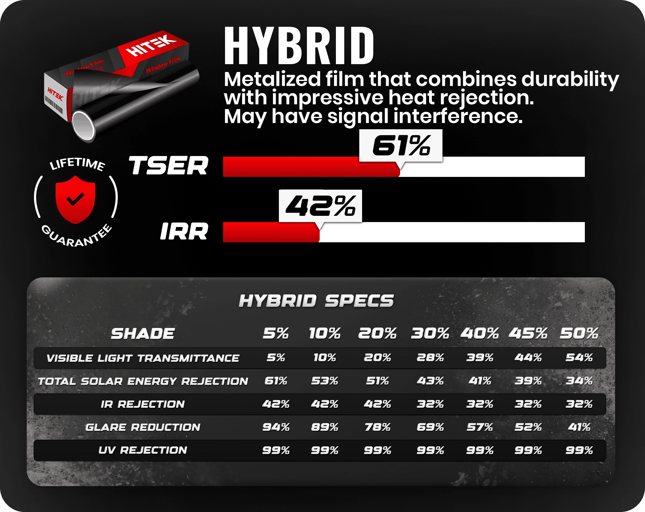 Hybrid is a metalized charcoal window film with excellent performance that features a classic look. This tint is manufactured with vacuum sputter-metalized technology to provide optimal solar energy reduction. The Hybrid series exhibits sleek, color tones that enhance the look of any vehicle. This attractive film is color stable and covered by a lifetime warranty.